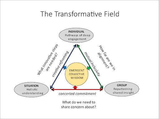 Participants are expected to bring with them an area of their life they wish to work on in a transformative way and be able to share aspects of that with the group. The methods emphasise the integration of three aspects of emergent wisdom