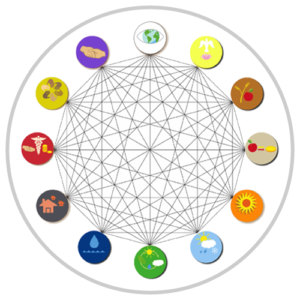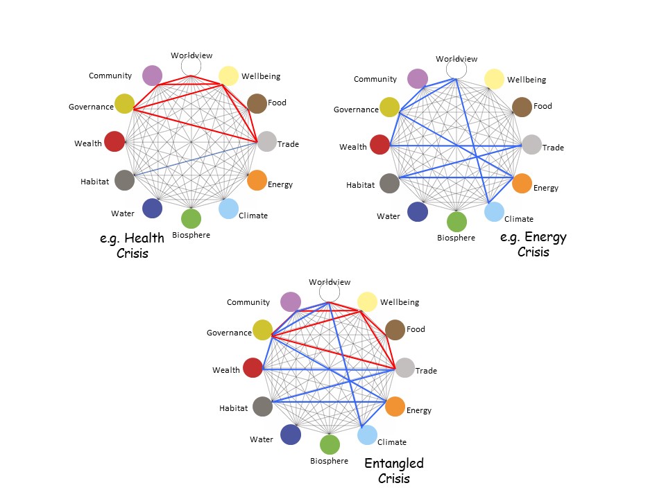 The examples here show a review of the primary interconnections of two complex crises. The first is a health crisis such as an epidemic (red lines). The crisis challenges the community`s world view and how it can be governed to achieve the public health policies. These have a knock-on effect to the food system and also the conditions of trade that make distribution possible. The second is an energy crisis such as a serious shortfall in the conversion from fossil to renewable energy (blue lines). This challenges the failure of governance to achieve agreements with effects on community and polarisation of worldviews as to the importance of climate targets. Habitat and infrastructure are compromised through, for example, pollution which questions the basis of a carbon intensive trade system.
