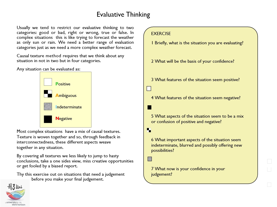 Usually we restrict our evaluative thinking to two categories: good or bad, right or wrong, true or false. In complex situations this is like trying to forecast the weather using only “sun” or “rain.” We need a better range of evaluation categories just as we need a more complex weather forecast.