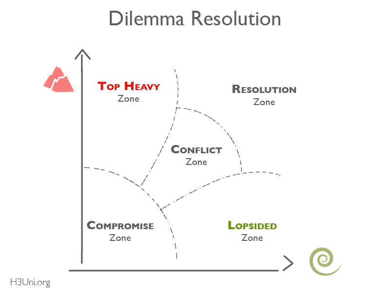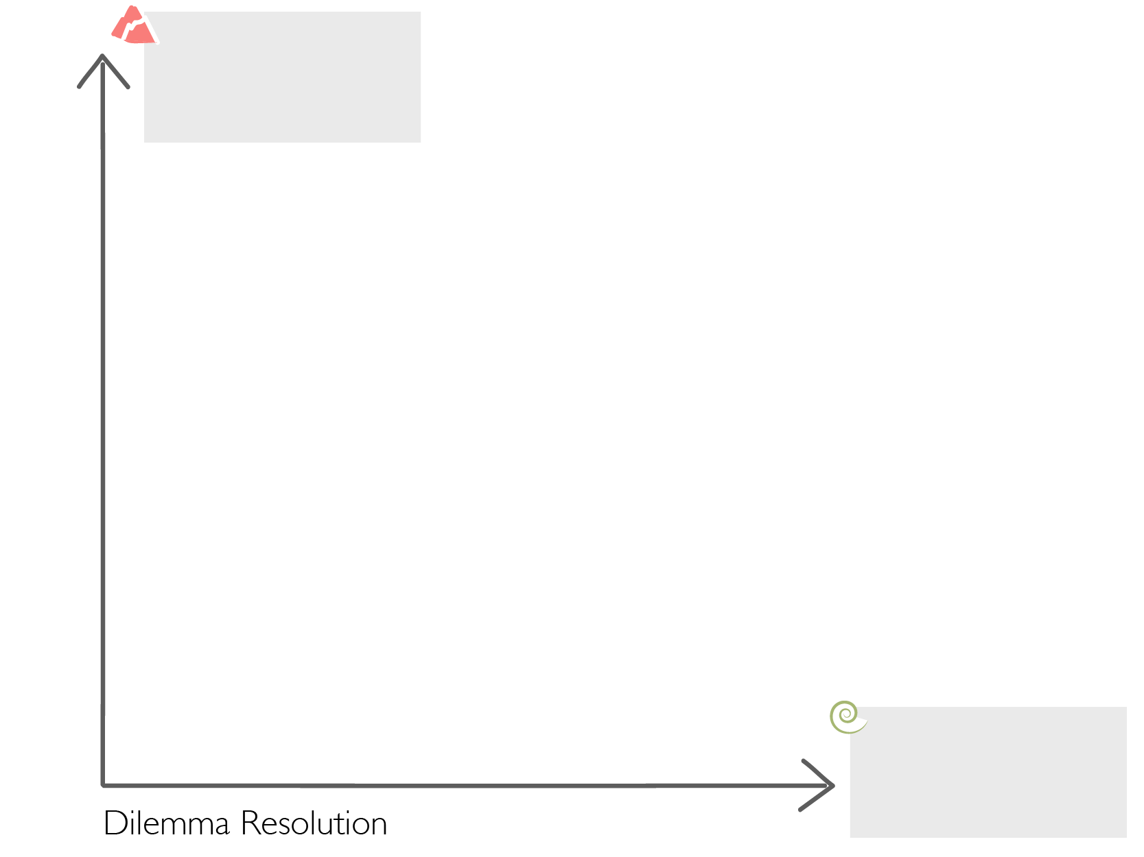 The simplest way to work with dilemma resolution is to use the representation of the dilemma as a space created by putting the two conflicting or contrasting values on the orthogonal lines instead of thinking of them as polar opposites. The diagram then provides a way of framing the results of the process.