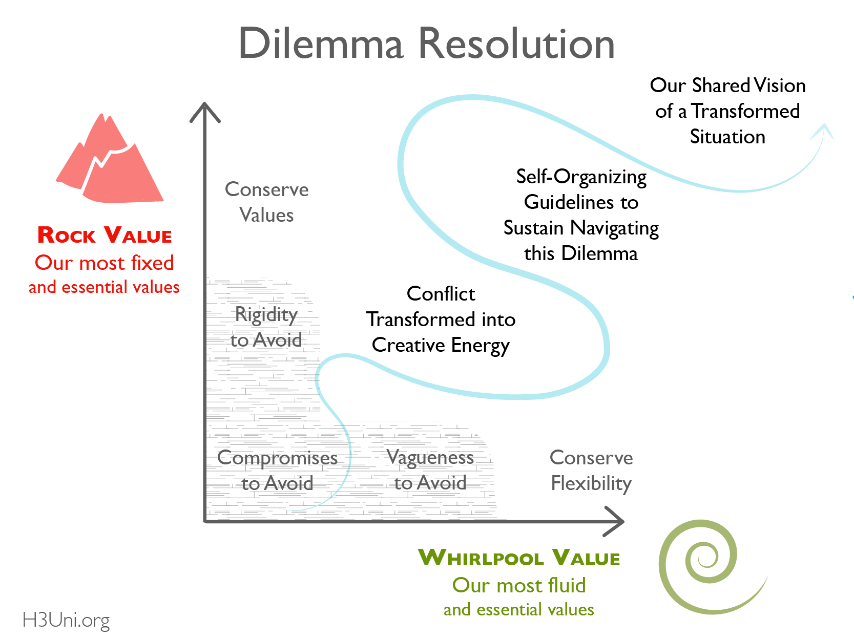 The dilemma framework enables the group to shift their orientation from either/or thinking (which won’t work in the given situation) to both/and (which can work) and use Dilemma Thinking and Generative Thinking to produce new options for action which integrate the two apparently conflicting values in innovative ways.