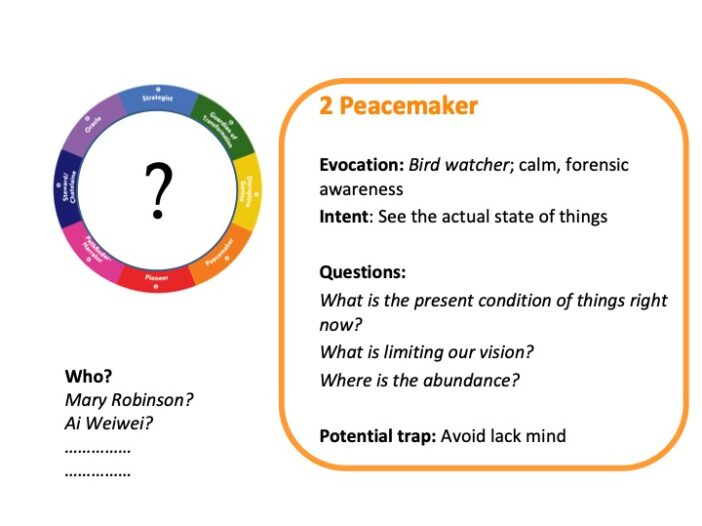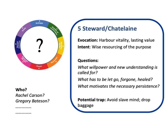 In the Steps that follow each Role has a set of questions that originate from its essence, which address the central Quest of the session. Have participants read and reflect on the questions. They are there to prompt reflection, discovery and resonance, to enable participants to formulate their insights in relation to the central question. Make notes to help the final review.