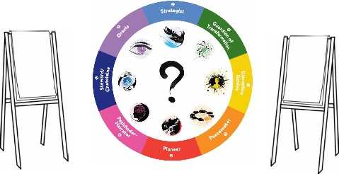 The eight circular Role emblems are laid down in a circle on the floor to form the Wheel, perhaps at the perimeter of a circular table cloth, with the Disruptive Genius aligned to the east, and the question mark emblem in the middle.