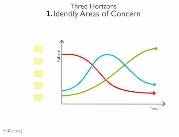Ask the team to look at the first horizon stickies and identify a headline summary of an issue of concern, or indication of the system losing fit to the future. Write this on a (larger) sticky and put on the vertical axis of the 3H map. Ask for which stickies go with this issue and line them up next to it.