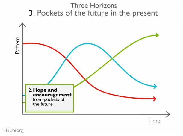 Identifying transformative (H2+) innovations that shift the system towards a desired future is not easy. Inspiring examples of aspects of your desired future already happening in the present will provide some encouragement. This process will help to identify what such innovation might look like, but does not own provide a process for generating innovative ideas.