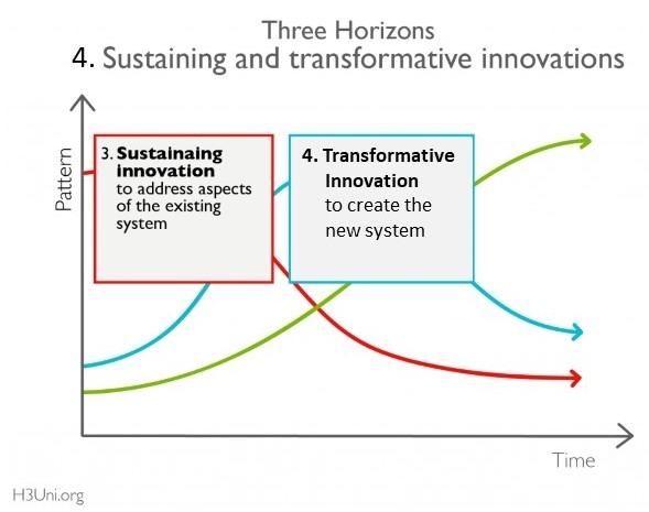 Sifting the actions and innovations between sustaining and transformative is likely to be a novel process for most people but it is one of the advantages that the Three Horizons approach offers: the twin-track innovation process of ‘redesigning the plane whilst flying it’.