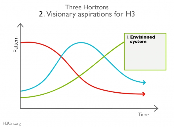 This is Stage 2 of the Three Horizon basic method, following on from Three Horizon Mapping. It is assumed that the team that developed the map wants to take action towards a desired third horizon future.