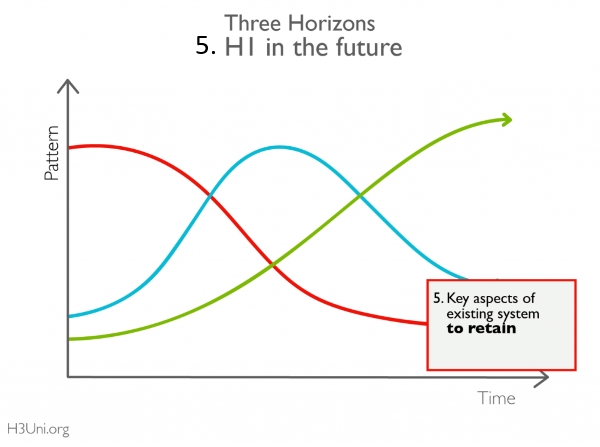 Capture any aspects of H1 that will play a continuing role in H3. This is for essential, foundational aspects of the existing system that will persist and be reconfigured in H3. Do not spend too long on this stage, it is a preparation for the final step (below), but it can help the group to see that the First Horizon can continue in new ways through transformation of its role.