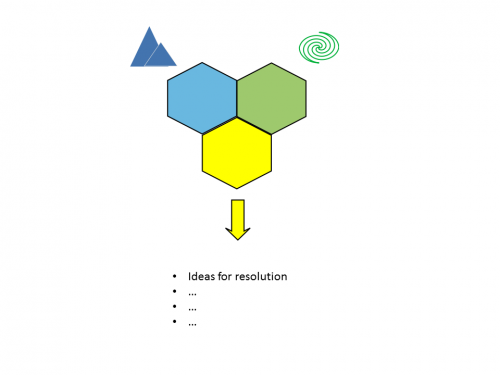 Ask yourself what new idea or ideas are suggested by the juxtaposition? Is there an idea that goes beyond both whilst retaining some of their significance? Try this a few times. Notice the way that just having this arrangement in front of you encourages your mind to hunt for a creative combination. You will find this approach to generative hexagon thinking used in Dilemma Navigation.