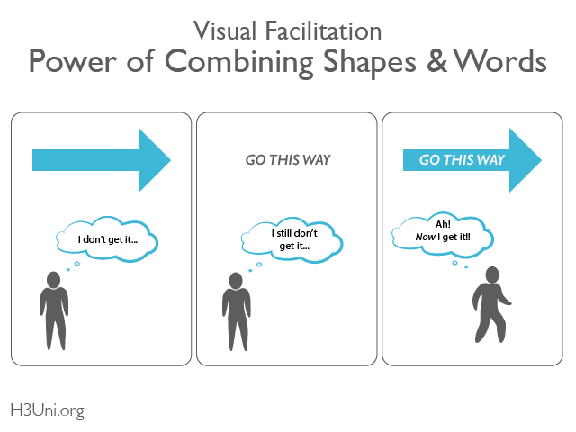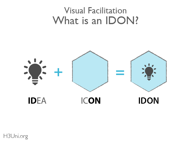 Combining shapes with words can be much more powerful than using just words or shapes alone. In H3Uni visual facilitation we make frequent use of combining words with shapes. We call this an ‘idon’ which is condensed from idea in an icon.